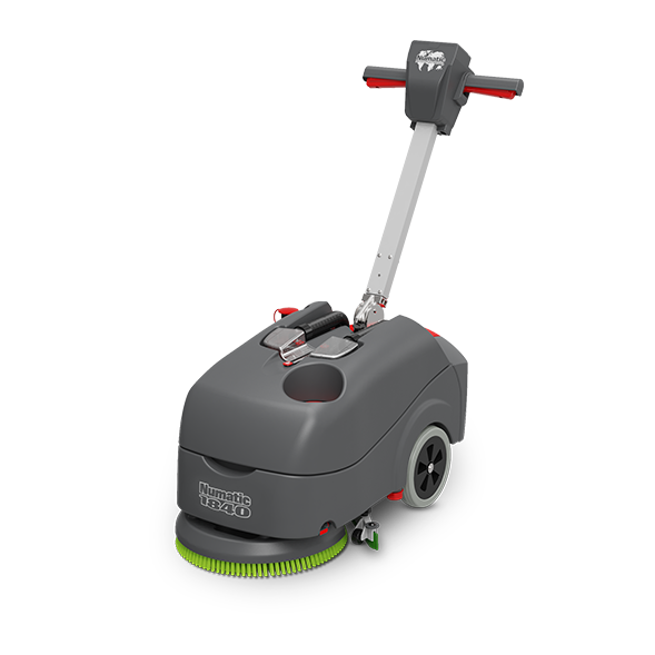 Compact mains-powered scrubber dryer with 18L capacity and 400mm scrub width for powerful, efficient cleaning.